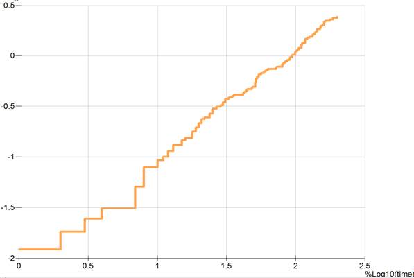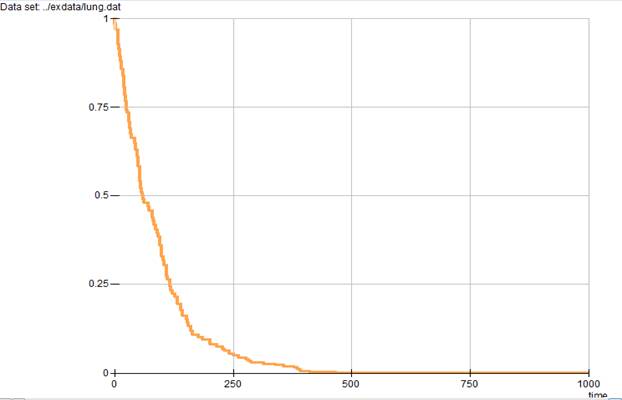instructs the program to compute the hazard, cumulative hazard, and survival function at each distinct failure time in the data set used for the most recently fitted model and to plot the survival function versus time. A short summary of the survival function will be written to the log file. This summary give the survival probabilities at the 90th, 75th, 50th and 25th and 10th percentiles of the survival distribution. For this example the summary table looks like this