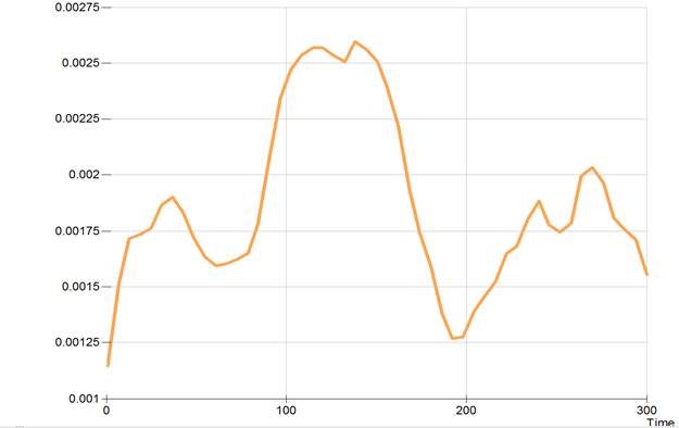 which requests a smoothed hazard function plot with a bandwidth of 30 days for the smoother. The time scale is limited to the first 300 days. In this analysis, the units for the hazard on the veritcal axis are cases per day. Unless explicitly suppressed by the user, a hazard estimate table will be printed by this command. (You can use the break key, usually CTRL-C, to stop the printing of an unwanted hazard estimate table.)