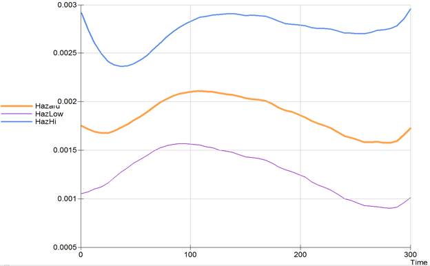 requests a smoothed hazard function plot with pointwise confidence bounds over the range of 0 to 300 days with a smoothng bandwidth of 100 days with the smoothed hazard data written to the log file.