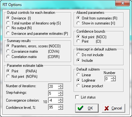 The first group of options (Output controls for each iteration) controls the amount of output printed for each iteration. The choices are to print the deviance at each iteration, only the total number of iterations, no output, or printing the deviance and parameter estimates at each iteration.