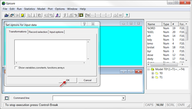 For this example, we ignore transformations and data input options in the dialog box. Click OK in the input data options dialog, at this point the data file is read into EPICURE.