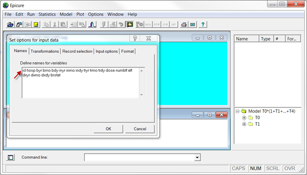 You see the window offering various options for input data. In this case, because the data file does not contain a header with variable names, we will enter variable names into the “Names” window: id hosp byr bmo bdy inyr inmo indy tryr trmo trdy dose numbtf aft dxyr dxmo dxdy brstat.