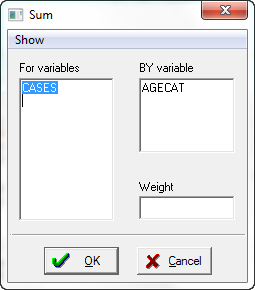 Computes sums of variables, possible over strata defined by one or more categorical variables. Only records in the current active subset are included in the sums. For an unweighted sum, the number of records summed is given. For a weighted sum, the sum of the weights is indicated. The output also includes information about the range for each sum computed.